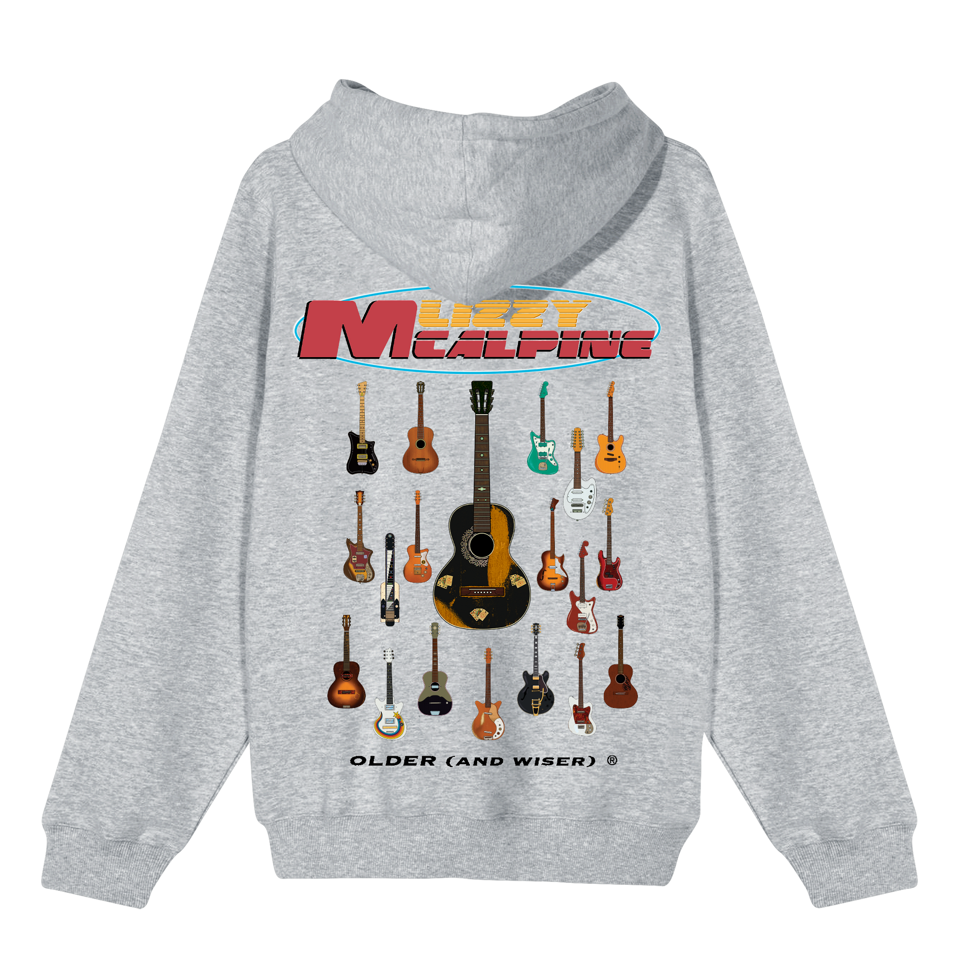 A unisex grey hoodie featuring logo design printed on the front, guitar graphic on the back, and logo design down both sleeves.